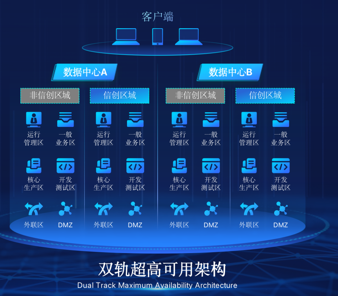 K8凯发官网在企业面临自主创新IT基础重构过程中,推出的全新架构双轨超高可用架构(简称DTMAA),在双活数据中心的分区调度基础上,添加每个数据中心内信创域和非信创域的分域调度,来实现分区分域协同的多活双轨超高可用。